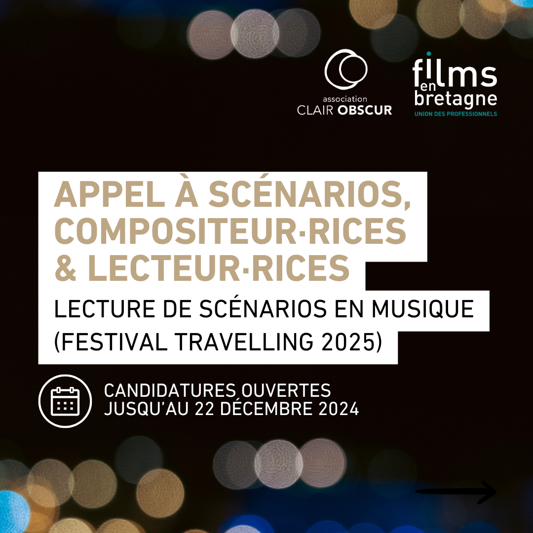 Dans le cadre de la 36ème édition du Festival Travelling (Rennes), Films en Bretagne et Clair Obscur s’associent pour proposer une lecture de scénarios (courts métrages) en musique. Ils seront interprétés par des comédien·nes et mis en musique par des compositeur·rices.