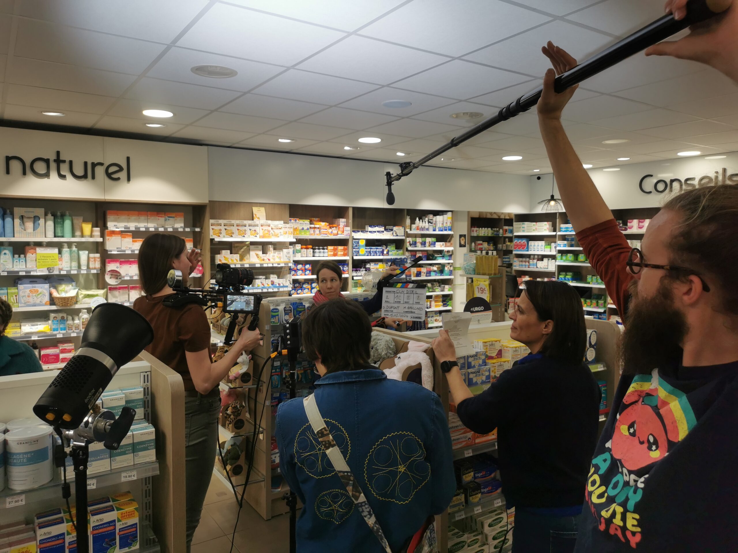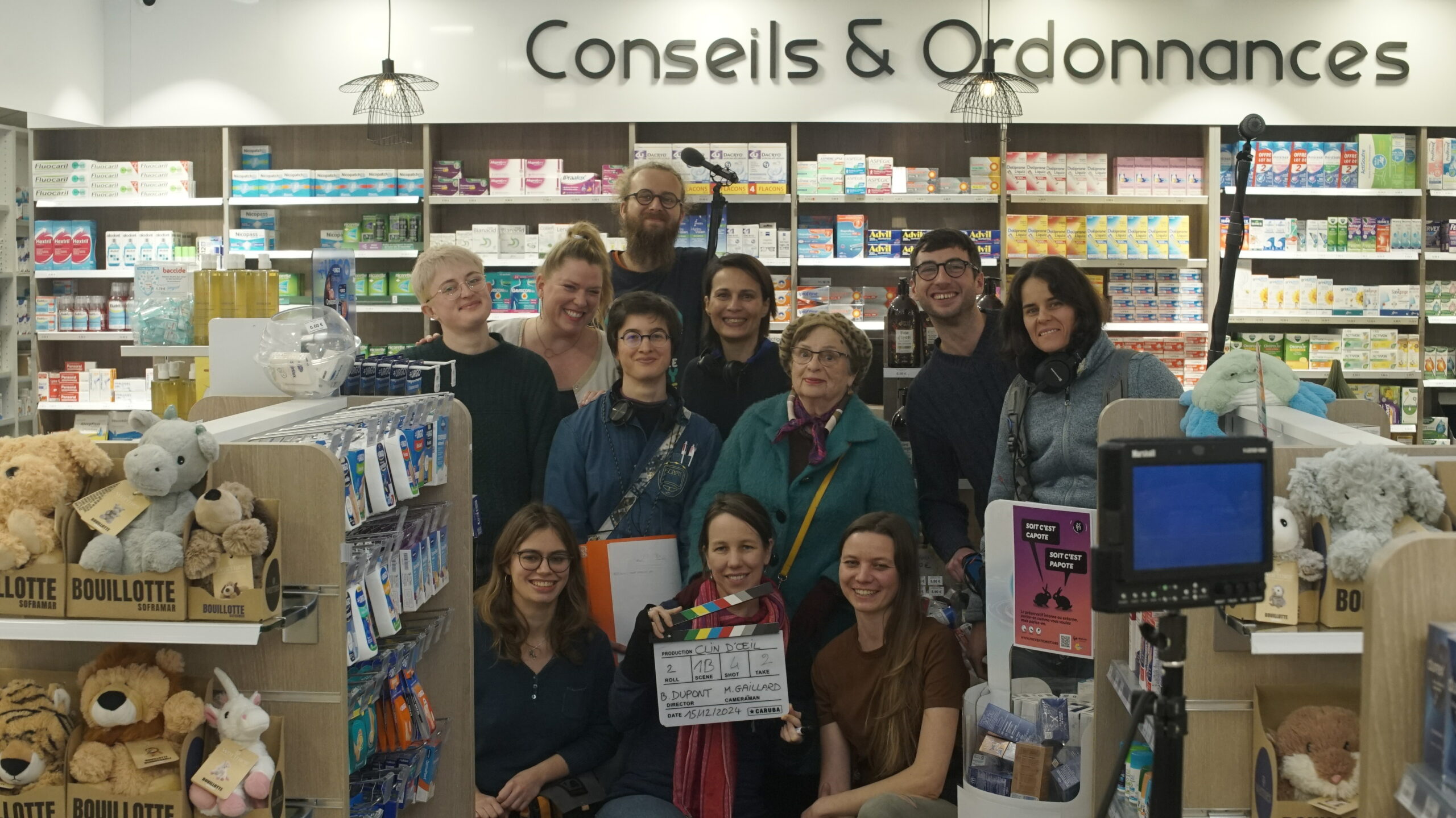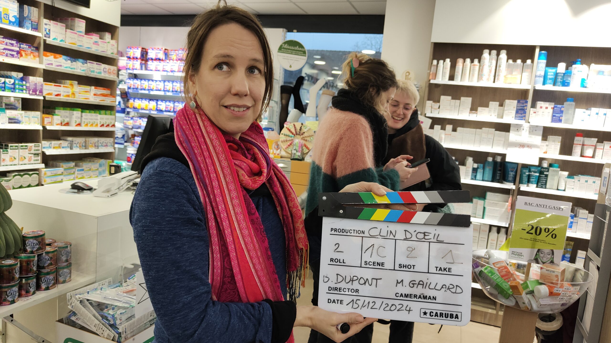 Début décembre, je tiens un scénario de 5 pages, une comédie engagée, Madeleine et les bombes à eau. Je cherche le décor et en même temps je commence à contacter des équipiers grâce au document en ligne du projet « Clin D’œil ». Il ressence toutes les coordonnées des volontaires. C’est un vrai bonheur de constituer cette équipe où chacun s’engage avec enthousiasme au casting ou en technique, sans autre moteur que celui de faire collectivement. Je ne fais aucune sélection par le CV, ce n’est pas la philosophie du projet. En revanche, j’appelle en priorité des adhérent·es Rennais·es, car la proximité aide à réduire les coûts pour chacun et le bilan carbone.