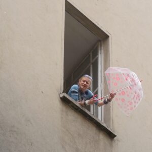 Image de la solitude, chanson seule à la fenêtre, un parapluie comme une ombrelle, et la vision bancale d’une comédie musicale, une demoiselle de Demy qui aurait fait le match retour. L’architecture, le graphisme de la scène dans une perspective soviétique, une perspective qu’elle a traversée, elle a bien connu ça. La chanson est un appel, ou une commémoration, ou une joie sincère. Quelle belle ambiguïté, O combien humaine, trop humaine. — |