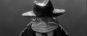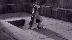 Au cœur de ce court récit, un personnage ambivalent, et même dissocié. Un personnage manifestement handicapé, traînant des membres supérieurs devenus tentacules. Son costume, son attitude, cette difformité, son asymétrie (nous y reviendrons tout à l’heure) tout concourt à le faire passer pour un monstre, d’autant qu’il semble, dans les premiers plans, revenir d’entre les morts. Les plans qui représentent cette dissociation (qui, en terme psychanalytique, s’apparente à une schizophrénie) sont d’abord les plans dans lesquels sa gigantesque ombre semble douée d’une vie propre, s’étalant sur un mur ou dans l’alignement d’une étroite ruelle. On verra plus tard que ce double n’est pas, contrairement à l’usage dans les films de genre, un double maléfique, mais l’expression d’un pouvoir magique et bénéfique, une sorte de métempsychose positive qui permet d’éclairer le monde. Une ombre paradoxale qui donne, en s’effaçant, vie à ce qui la rend possible, la lumière, inversant la loi naturelle.