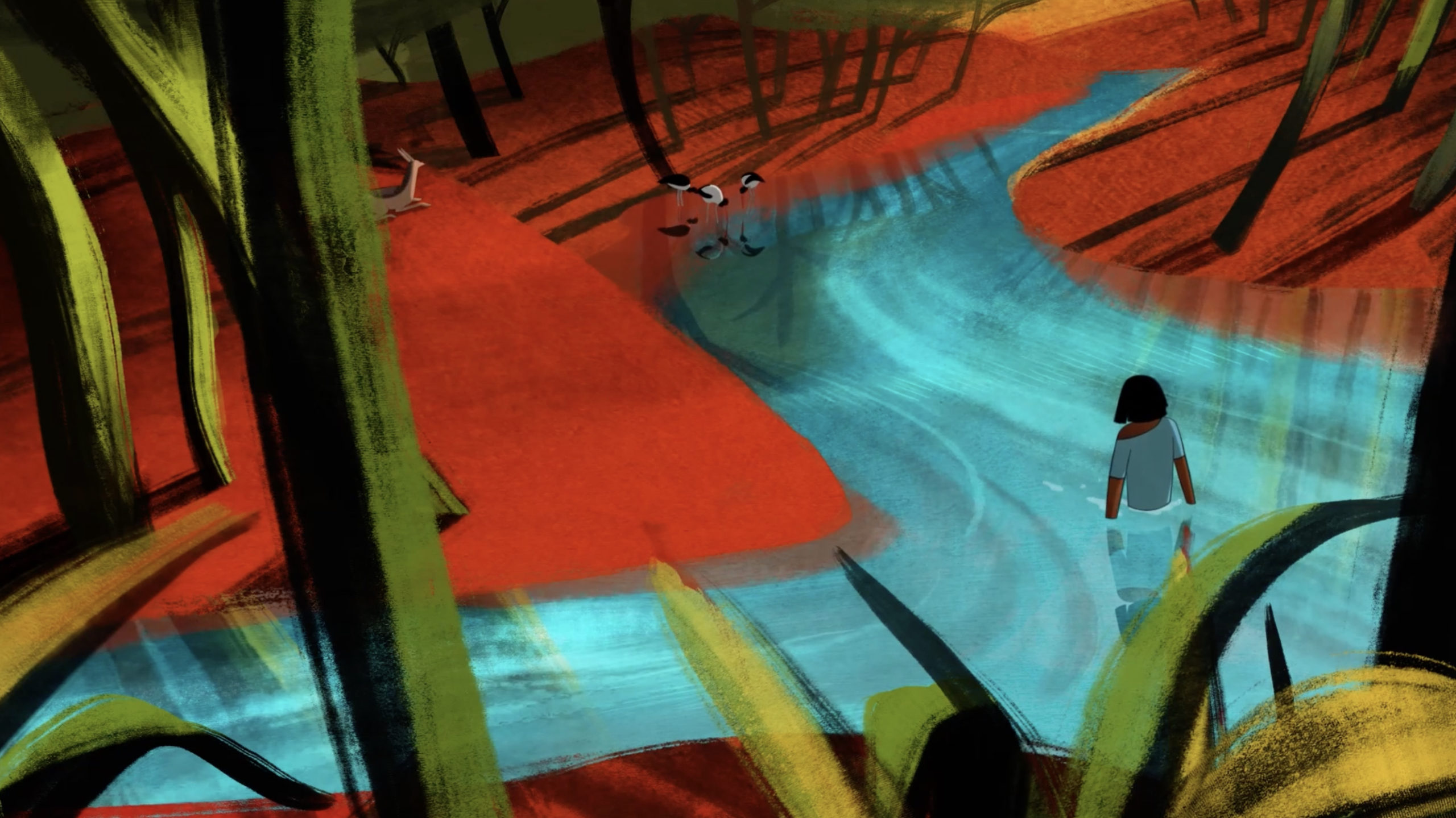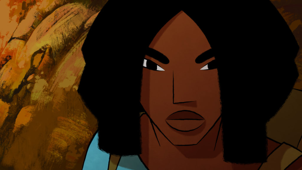Le film s’ouvre sur un paysage de rêve : les couleurs chatoyantes d’une forêt tropicale, la musique de la pluie fine qui martèle les feuilles, les chants des oiseaux qui l’accompagnent. Petit à petit la pluie s’intensifie et cogne, des bruits de balles fusent, la respiration d’un homme qui court s’accélère. Puis, atteint par une balle, l’homme s’effondre dans un lac. La guerre n’est jamais loin dans Nayola, en fait elle est toujours là et se rappelle brusquement : à la façon de soldats qui surgissent des hautes herbes d’un champ placide ou lorsque le brasier d’un coucher de soleil se confond avec les flammes qui ont dévasté un village. Une manière d’entrer de plein fouet dans l’histoire de l’Angola, pays plongé dans des décennies de guerre. Après avoir gagné son indépendance contre la puissance occupante portugaise en 1975, des chefs rivaux appuyés par des puissances étrangères- bloc soviétique, contre Afrique du Sud et États- Unis – s’affrontent pour le contrôle du pouvoir et des richesses pétrolières. On n’en saura pas plus sur les forces en présence, juste que c’est une guerre fratricide, et forcément absurde. Une scène le raconte bien : un neveu tient en joue son oncle qui vient d’être fait prisonnier et lui explique qu’il est dans le mauvais camp. Quelques instants plus tard, il le libère : l’oncle donne une taloche à son jeune neveu, et le reconduit chez sa mère où il posera son fusil et reprendra ses habits et ses jeux d’enfants.