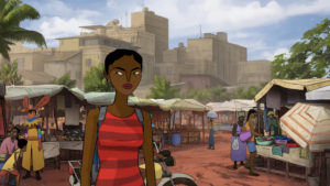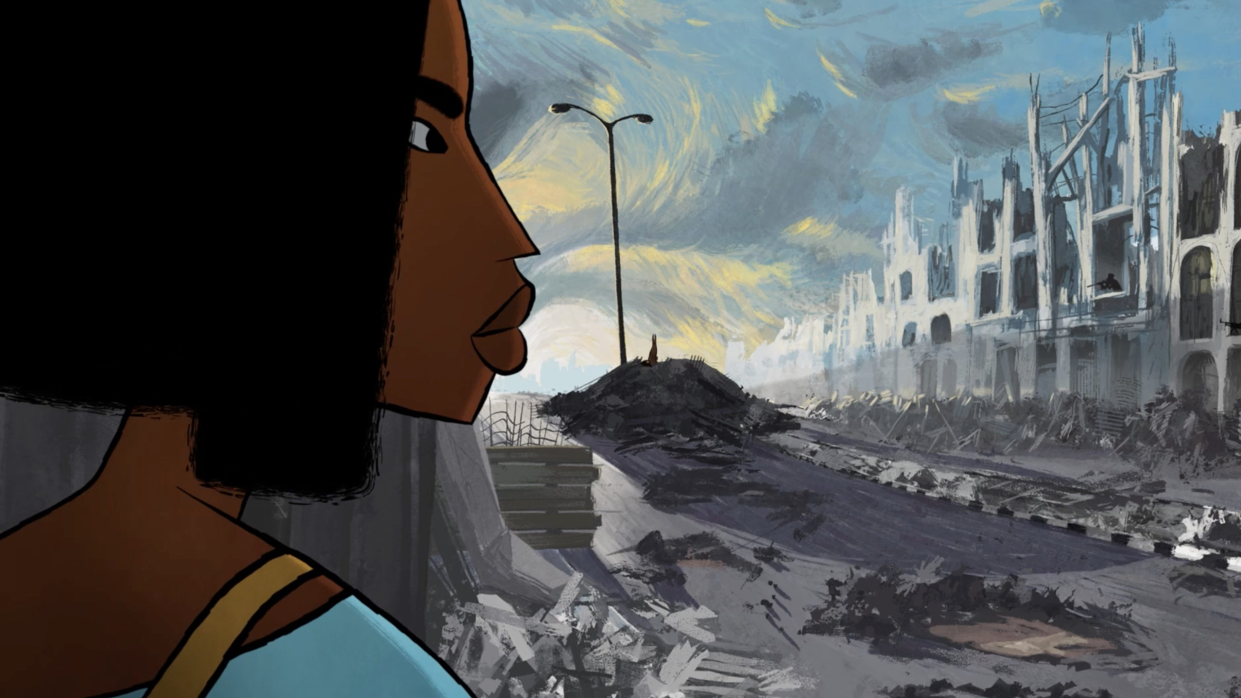 La quête, la perte et l’abandon, l’amour, le sacrifice : toutes ces thématiques traversent le film et chacune des héroïnes s’en empare et s’y débat pour y trouver un sens. Ce road movie nous emmène dans des décors magnifiques ou intenses : paysages luxuriants et ville vibrante. L’atmopshère est tour à tour très réaliste, en 3D ou avec certaines images d’archives qui font irruption et où le grain épais et le noir et blanc ne masquent rien de la crudité de la guerre. Parfois les traits se font plus vagues, diffus, liquides : esquisses de moments tendres qui ont la fragilité des souvenirs . Ces passages, ces changements de registres graphiques sont très réussis et emportent le spectateur, comme les flash-backs. Les “mouvements de caméra” récréés par l’animation : plongée, panoramique, rythment l’histoire. On y croise une riche et improbable galerie de personnages : un sniper qui joue de la guitare, un chef d’une gare fantôme, une infirmière de la croix-rouge qui chante pour des réfugiés dans un immeuble en ruine, un chacal fidèle qui fait des miracles.
